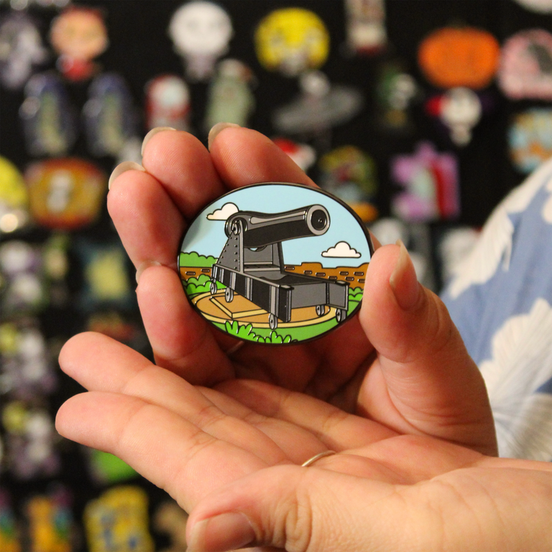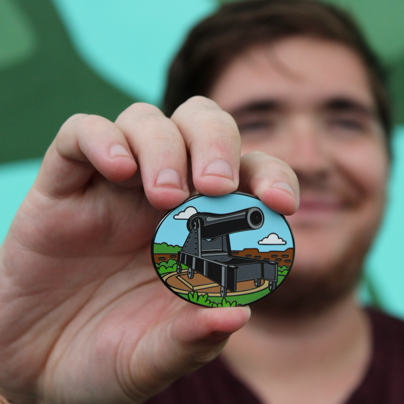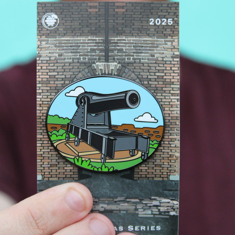 Along the south side you’ll find the subject of our next pin: the Rodman gun. These massive cannons were designed to protect the sea approaches to the Gulf of Mexico. Our Rodman Gun pin captures one of these heavy guns resting in its brick emplacement, aimed out over the water, clouds and blue sky framing the scene.