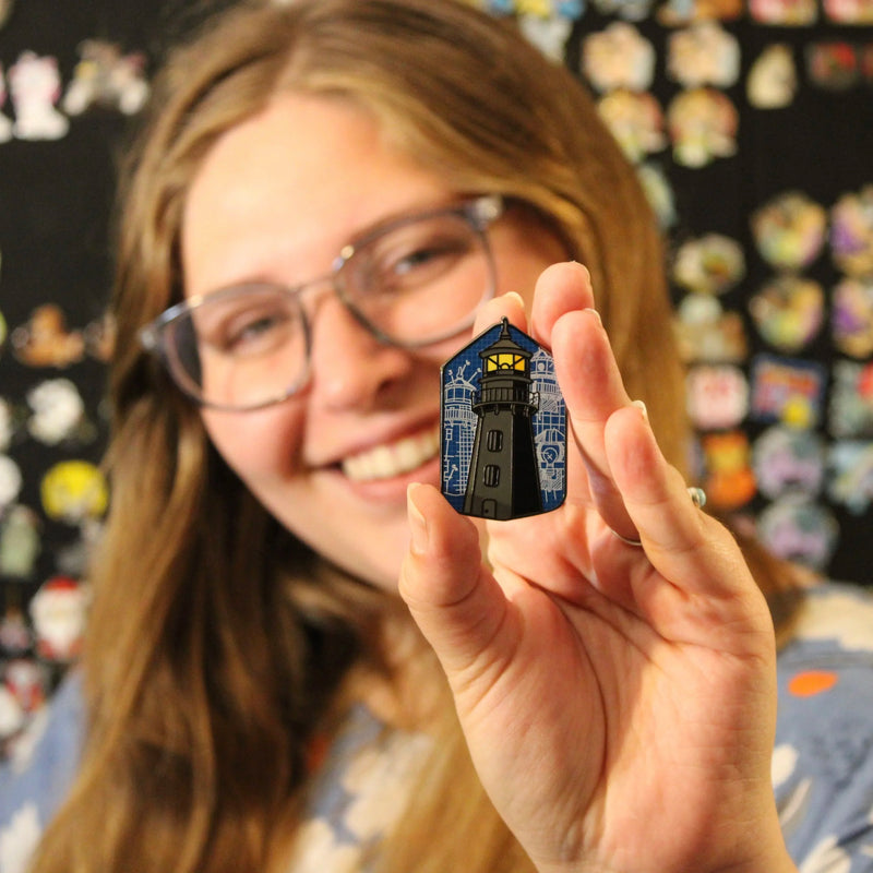 The light is no longer in commission, but our design shows it glowing on purpose. Our founder lived and worked out here for a period of time and was lucky enough to be present when the lighthouse was briefly relit. That rare moment, seeing the lantern room shining again, earned its permanent place on the pin.