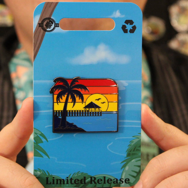 Our final pin brings the tour full circle: the Sunset in the Florida Keys pin. Picture the sky going gold and then deep orange, a pier stretching into the water, and palm trees silhouetted against the last light. Back in Key West, sunset at Mallory Square is its own celebration: street performers, music, and everyone turning to watch the sun drop into the sea.