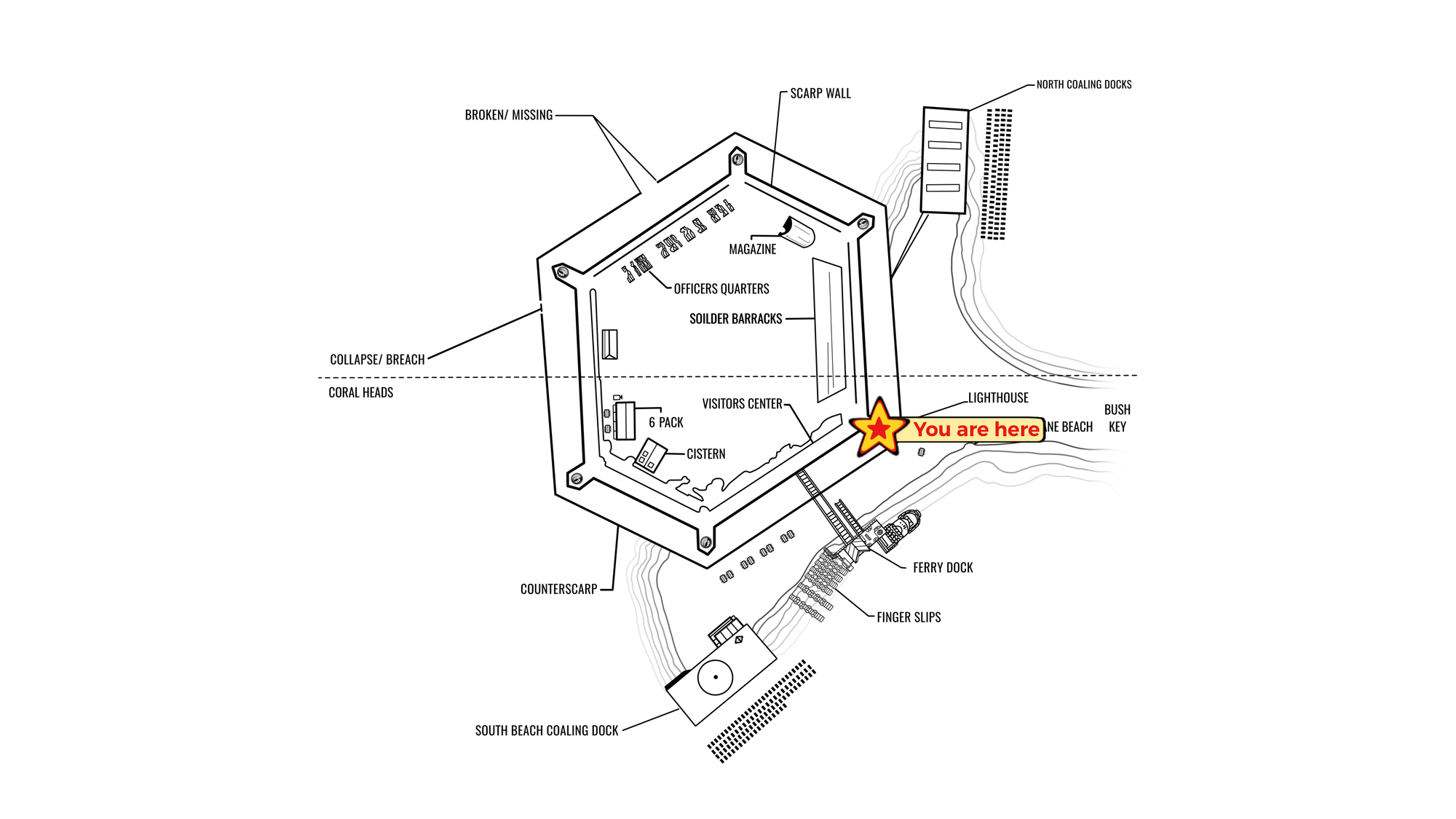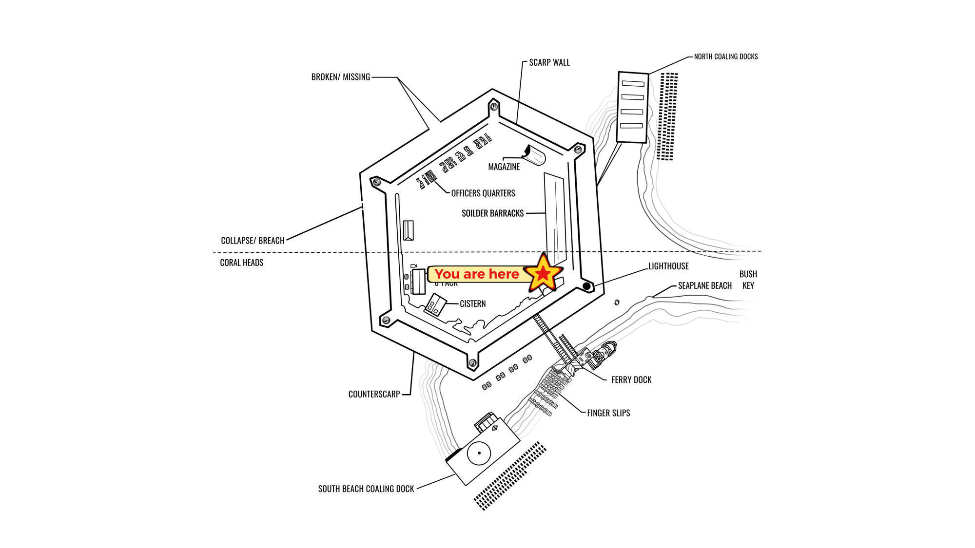As your boat lines up with the dock, look toward the fort’s corner. Rising above the brickwork is the Garden Key lighthouse, the star of our blueprint pin.
