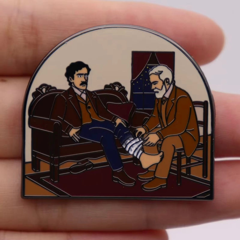 Our Dr. Mudd and John Wilkes Booth pin doesn’t show the inside of the fort, though. Instead, it captures the moment that set the whole story into motion: John Wilkes Booth arriving at Dr. Mudd’s home with a broken leg after fleeing Washington, D.C. The pin shows Mudd setting Booth’s leg, a quiet domestic scene that would carry enormous consequences.