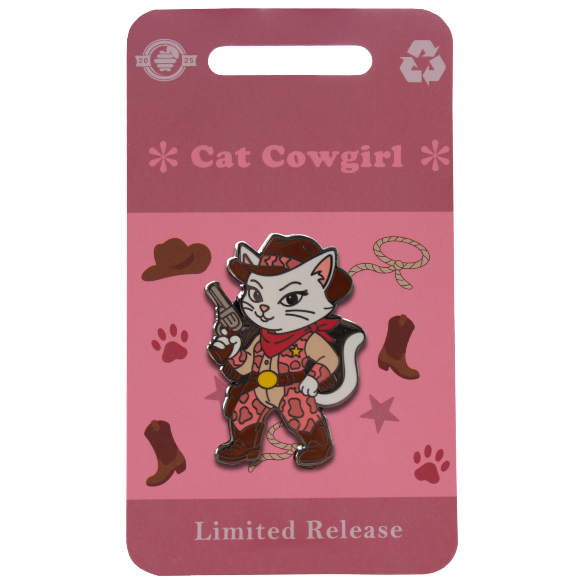 This limited release enamel pin features the Cat Cowgirl, a fearless feline ready to hit the open range. With her wide brimmed hat, pink bandana, and cow print chaps, she stands tall with her revolver at her side and a playful sparkle in her eyes. The design brings a touch of western flair and charm to any pin collection.