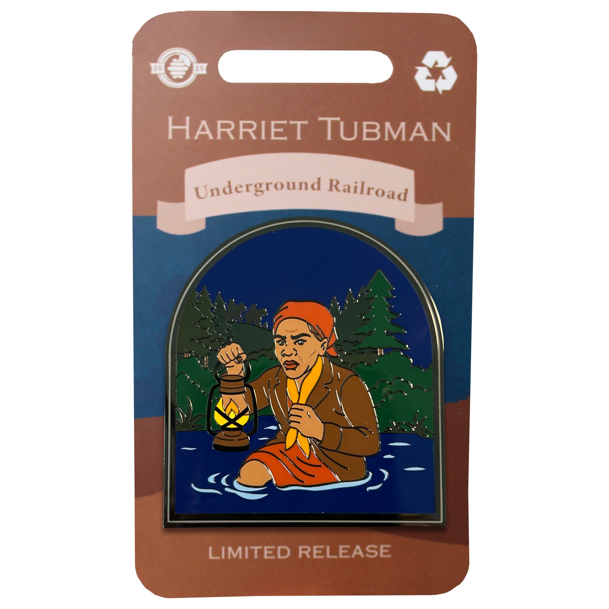 As part of our 2025 Historical Series, this limited release enamel pin honors Harriet Tubman, one of the most courageous leaders in American history. The design captures Tubman wading through water by lantern light, guiding freedom seekers along the Underground Railroad. Surrounded by forest silhouettes, this moment symbolizes both the danger and determination that defined her extraordinary work.